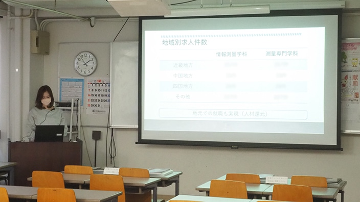 学校説明では、測量の仕事、近畿測量専門学校が選ばれる理由、取得資格・目標資格、選考方法、学費そして就職実績について詳細にお話しいたしました。